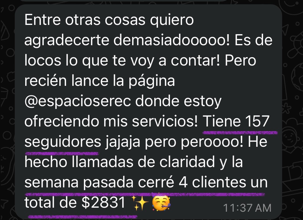 Llamadas de mentoría y claridad cada 15 días donde definirás tus metas mensuales para tu negocio, con su respectivo plan de acción para lograrlas, trainings para subir tus precios, trainings en vivo para sanar tu relación con el dinero, romper creencias, aprender a atraer más abundancia