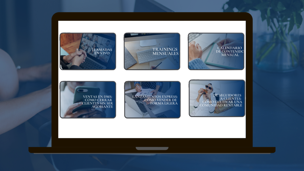 Vas a recibir un training avanzado cada mes para potenciar tu estrategia digital, al igual que cursos completos enfocados en distintos objetivos: Ventas, Marca Personal, Contenido que vende y más….